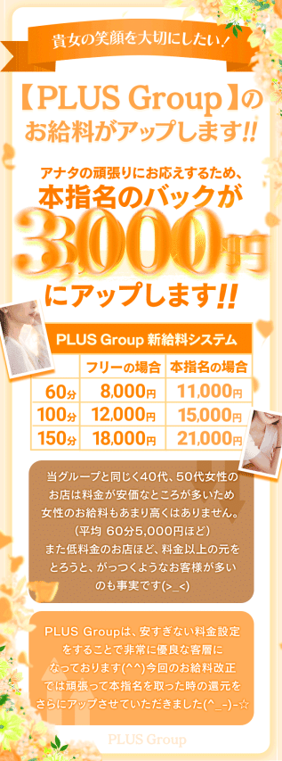 | 給与 | 【PLUS GROUP】入店キャンペーン♪ 本指名料金も変わらず3000円お渡し致します♪ 適用条件は【入店するだけ!! 】 全員適用しています✨ 貴方の人生を変えることができるのは その一歩です♪ お話だけでも大歓迎なんです! 是非一度お問い合わせ下さい♪ 平均給与(入店~半年以内の女性で算出) 6時間勤務女性→42,000円 8時間勤務女性→53,000円 10時間勤務女性→70,000円 ★60分コースバック¥8,000~最大¥11,000! |