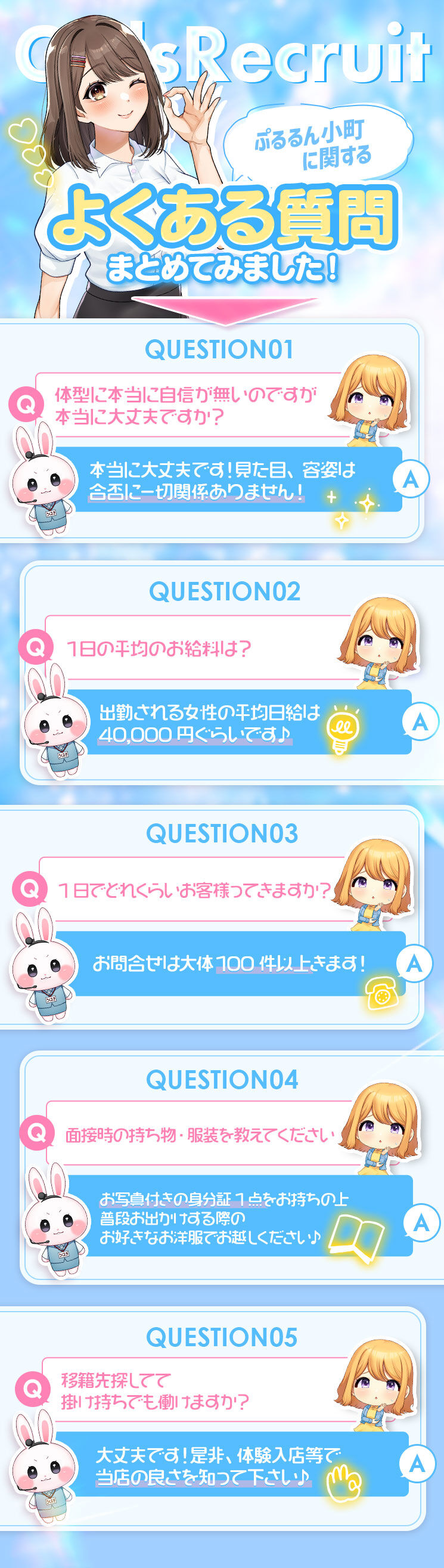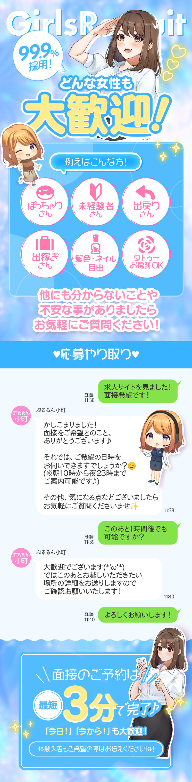 【ぷるるん小町の充実した待遇をご紹介】 ◆平均日給4万円以上 エリアトップクラスの集客力を誇っているので お仕事の本数に絶対の自信あり♡ 指名料(2,000円)も全額支給で、 雑費引きもないから効率よく稼いでお帰りいただけます♪ ◆完全!個室待機室完備 グループ総数100部屋以上の個室をご用意しているので 必ずひとり一部屋!アナタだけのプライベート空間で 大切な休憩時間をゆっくりお過ごしいただけます◎ ◆身バレ対策 ネットでのお顔出しは一切なし。 また、接客前はお客様のお顔を事前にモニター確認で 確認できるので、万が一にもお知り合いに合うリスクを避けられます。 ◆アリバイ会社完備 実在する法人経営のアリバイ会社をご用意。 各種書類の発行から、緊急時のお電話対応まで 専用部署の女性スタッフが対応させていただきます。 ◆仕事道具支給 女性の皆様に負担なくお仕事していただけるよう 備品からお仕事用の携帯電話まで 全てお店でご用意させていただいております。 よくある10%引きなど、その日のお給料からの 引き物も一切なし◎ ◆月給保証制度有り 業界での珍しい月給保証制度導入店舗。 ご希望や出勤スタイルに合わせて一人ひとりご相談しておりますので 詳しくは面接時にお話させていただきますね。 ◆マンション寮完備 大阪市内に複数のマンション寮がございます。 生活家電つきなので、カバン一つで即日入寮OK! ◆衛生対策徹底店舗 アルコール除菌・マスク完全着用・検温の徹底など 新型コロナウィルスには万全を期しております。 また、無料の検査キットのご用意もございますので ご希望の方はスタッフまでお声かけくださいませ。 |
