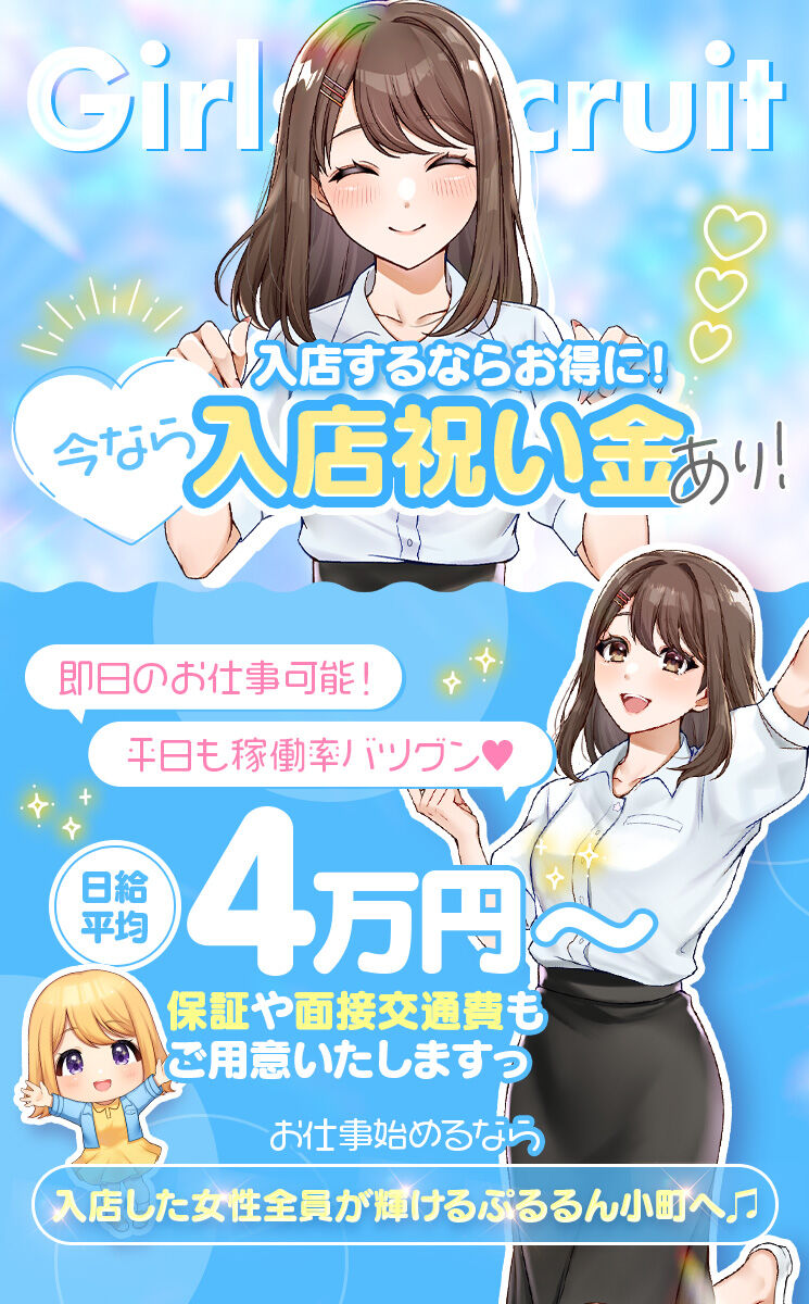 【ぷるるん小町の充実した待遇をご紹介】 ◆平均日給4万円以上 エリアトップクラスの集客力を誇っているので お仕事の本数に絶対の自信あり♡ 指名料(2,000円)も全額支給で、 雑費引きもないから効率よく稼いでお帰りいただけます♪ ◆完全!個室待機室完備 グループ総数100部屋以上の個室をご用意しているので 必ずひとり一部屋!アナタだけのプライベート空間で 大切な休憩時間をゆっくりお過ごしいただけます◎ ◆身バレ対策 ネットでのお顔出しは一切なし。 また、接客前はお客様のお顔を事前にモニター確認で 確認できるので、万が一にもお知り合いに合うリスクを避けられます。 ◆アリバイ会社完備 実在する法人経営のアリバイ会社をご用意。 各種書類の発行から、緊急時のお電話対応まで 専用部署の女性スタッフが対応させていただきます。 ◆仕事道具支給 女性の皆様に負担なくお仕事していただけるよう 備品からお仕事用の携帯電話まで 全てお店でご用意させていただいております。 よくある10%引きなど、その日のお給料からの 引き物も一切なし◎ ◆月給保証制度有り 業界での珍しい月給保証制度導入店舗。 ご希望や出勤スタイルに合わせて一人ひとりご相談しておりますので 詳しくは面接時にお話させていただきますね。 ◆マンション寮完備 大阪市内に複数のマンション寮がございます。 生活家電つきなので、カバン一つで即日入寮OK! ◆衛生対策徹底店舗 アルコール除菌・マスク完全着用・検温の徹底など 新型コロナウィルスには万全を期しております。 また、無料の検査キットのご用意もございますので ご希望の方はスタッフまでお声かけくださいませ。 |
