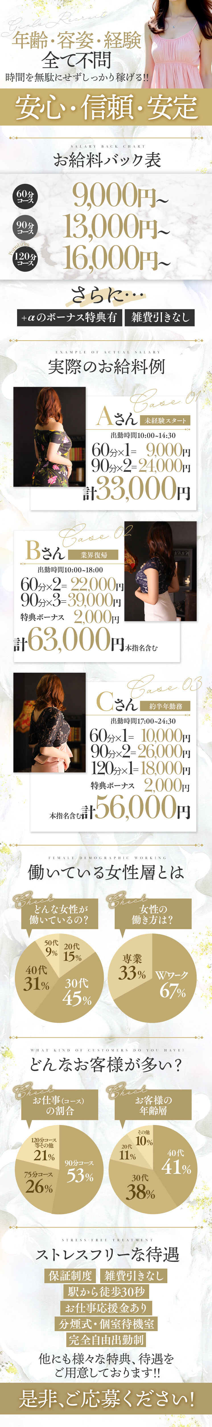 | 保証条件 | 保証につきましては、ご希望に合わせてご用意させていただいております。 目標やご希望の金額がございましたら、求人窓口までお伝えくださいませ♪ |