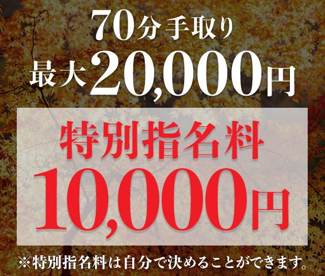 大人の魅力が活きる職場!40代だからこそ活躍できるお店✨ 今なら入店者全員!!大好評の入店特典✨①入店初日の全額バック✨新人期間→60分13,000円~本指名バックで+3,000円✨その他好待遇をご用意しております!!