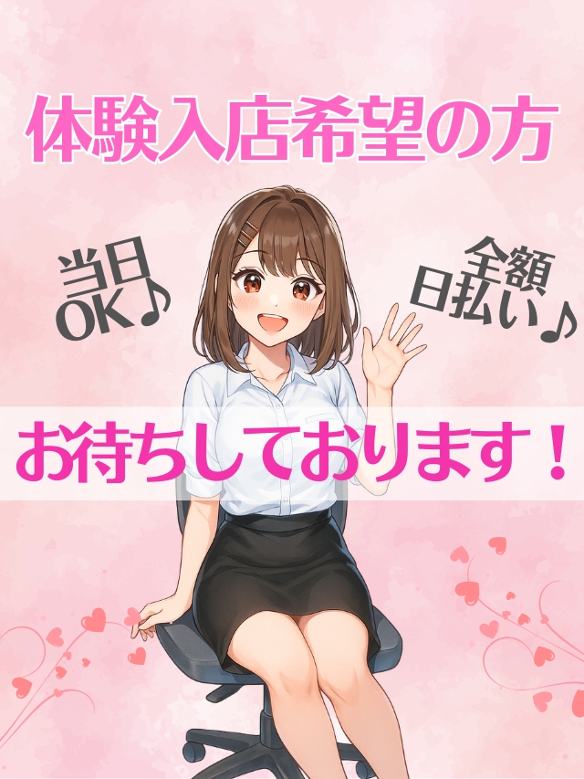 | 体験入店の備考 | ご希望金額や出勤体制も踏まえて お越しいただいた際に担当より 直接ご案内させていただきます◎ |