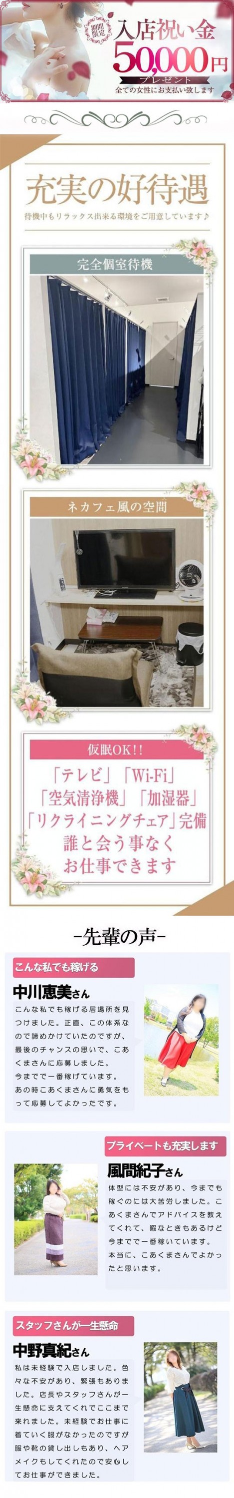 人妻・熟女日本最速 5年で全国42店舗出店!! 『入店祝い金5万・地域最高額バック・最低給料保証・面接交通費全額支給 業界最大手クループだから出来る好待遇』 20代~60代の方で主婦・シングルマザー・独身・バツイチの方を問わず募集しています! 他店で断られた方も大歓迎ですのでご安心ください!! 【こあくまグループ】 は全ての女性、特に30代・40代・50代・60代の女性のためのグループです 人妻店として2006年2月に立ち上げ19年以上、本気でマジメに営業してきました。 お客様のお好みも色々あります、当店は色々なタイプの奥様を募集しています。 ですから。。。 容姿・体型に自信がなくても全然OKです! 20代・30代・40代・50代・60代位までの奥様大募集しています! 週1回、2~3時間の出勤もOK ! どんな些細な事でも結構です。 あなたの明日の一歩になれるよう働く女性を KOAKUMAグループは全力で応援致します。 ☆こあくまグループで働く7つのメリット☆ メリット1 全員あなたと同世代ですから、若い子が有利なんてありません。 メリット2 顔出し、セミヌード、下着などは撮影は一切ありません。 メリット3 見た目は採用の合否に全く関係ありません。しっかりサポートします。 メリット4 地元では働きたくない方はグループの他県で受け入れます。 メリット5 激安店ではありません。最短が60分コースなので余裕のある紳士的なお客様が多いです。 メリット6 テレビ、インターネット、リクライニングチェア完備の個室待機可能。ほかの女の子に会うこともないです。 メリット7 交通費、ガソリン代、駐車場代、当日支給!