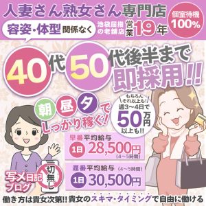 口コミ投稿☆ありのままの貴女で活躍できます!!☆ 年齢や体型を気にされて一歩踏み出せないという貴女、今在籍しているお店でイマイチ満足のできる稼ぎがないという貴女。 当店の在籍平均年齢は52.25歳!!採用基準に体型・スタイルは一切関係有りません!! あなたの年齢、成熟したスタイルがウリになるのが当店です!! ☆お仕事は至ってシンプル☆ 【路上待合せ】【自宅出張】【遠方出張】ナシのホテル専門・直行型の【デリバリーヘルス】でございます。 女性の貴重な時間を無駄なく無理なく効率よく稼いでいただける環境を用意しております!! また、写メ日記やブログ、お客様への営業メール等一切必要ありません。集客は全てお店が行いますのでご安心下さい!