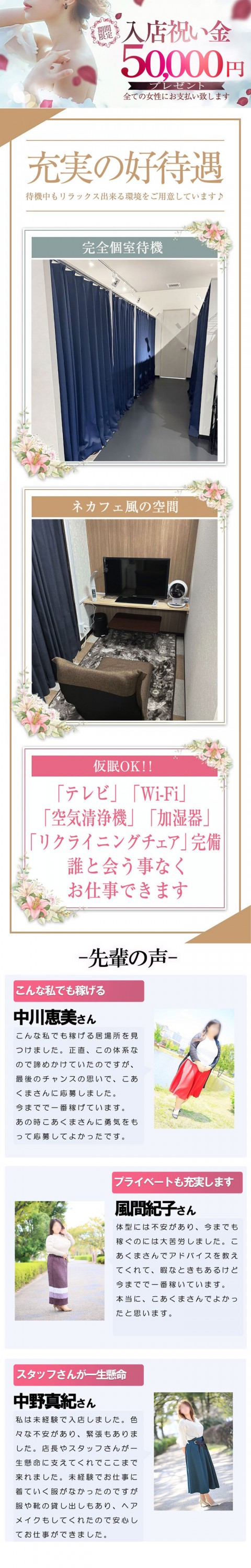 最低給料保証 日給40,000円以上 完全日払い制ですのでご安心ください。 当店なら年齢・体型・経験に関係なく稼げます! 年齢や体型などを理由に働く事を諦めていたあなたも ぜひ私たちと一緒にこのお店で頑張ってみませんか? 完全全額日払い&オプション全額バック! ☆給料シュミレーション☆ 出勤:8時間/1日、週3~4日 F.Kさん(52歳) 1日で¥48,300 月に¥620,800 子供の教育費のためにしっかり働く! 出勤:8時間/1日、週3日 H.Kさん(58歳) 1日で¥38,800 月に¥526,500 一般職の勤務時間と同じで 収入は大幅アップ! 出勤:4時間/1日、週3日 T.Sさん(48歳) 1日で¥23,700 月に¥299,800 母親の介護の合間に効率よく出勤 ※キャストさんの終了時間等の厳守 時間を過ぎて勝手にお仕事を入れられることはございません 当店は頑張る女性たちを全力バックアップ★ 快適に働いて頂ける環境をご用意致します! ご要望があれば遠慮なく仰ってくださいね♪ まずは面接でどれくらい稼ぎたいか 具体的な目標をお聞かせください! お話をするだけでも構いませんので 気楽な気持ちでいらしてくださいね♪ |