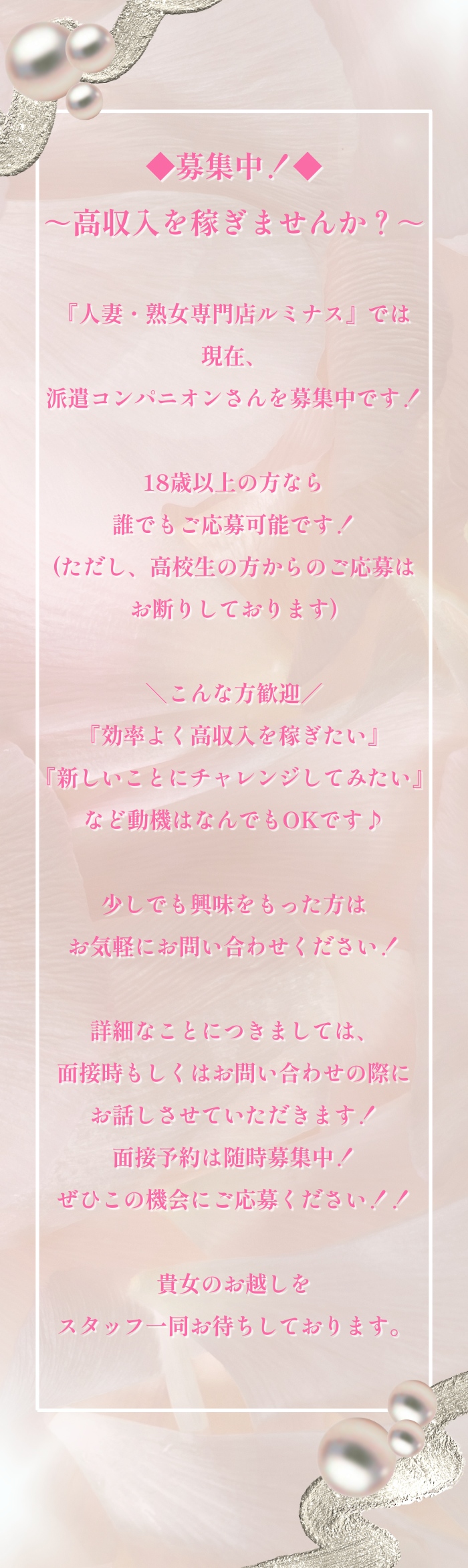 見た目年齢30代~50代の人妻さん、シングルマザーさん、熟女さん大募集(^^)/ 未経験大歓迎! 経験者も大歓迎! 採用率99% 容姿や体型に自信の無い方も大丈夫(^_-)-☆ お客様の好みは十人十色なので積極的に採用いたします! 当店は女性オーナー、女性スタッフの多いお店なので、異性に相談しにくい事も気軽に相談出来ます(^^♪ 業界経験の長いスタッフも在中していますので、お仕事での悩みや困り事など色々な面でサポート出来るお店です! 貴女からのお問い合わせお待ちしております。